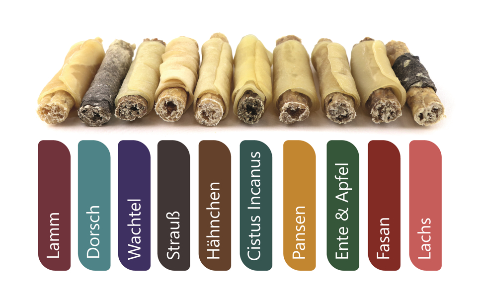 Im Lieferumfang enthaltene Geschmackssorten: Rinderhaut mit Lamm; Rinderhaut mit Dorsch; Rinderhaut mit Wachtel; Rinderhaut mit Strauß; Rinderhaut mit Hähnchen; Rinderhaut mit Cistus lncanus; Rinderhaut mit Pansen; Rinderhaut mit Ente & Apfel; Rinderhaut mit Fasan; Rinderhaut mit Lachs.