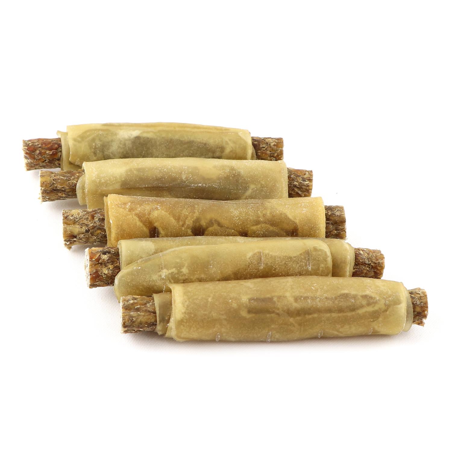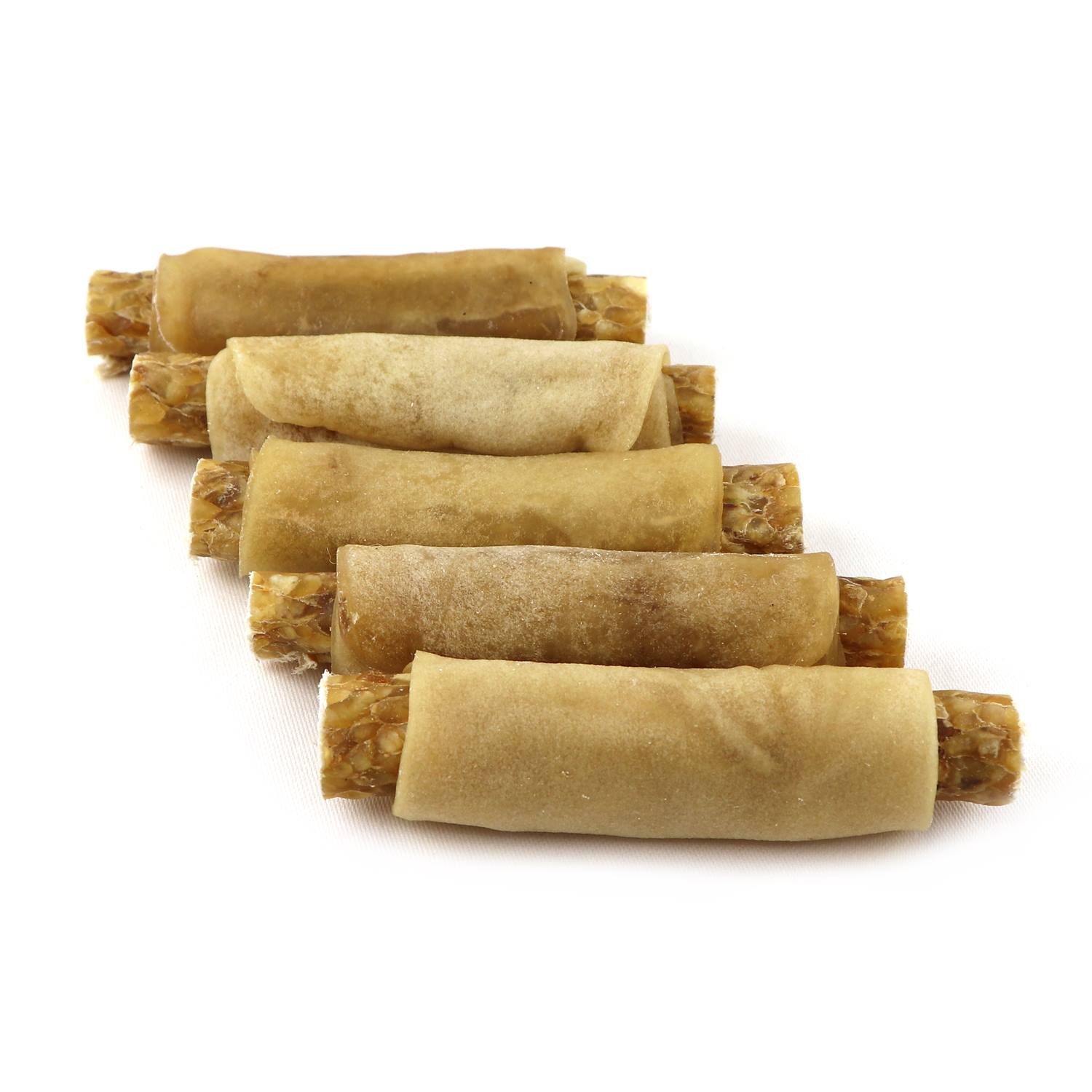 Die gefüllten Kaurollen bestehen aus 95% Rinderhaut, 3% Strauß, 2% Ochsenziemer.