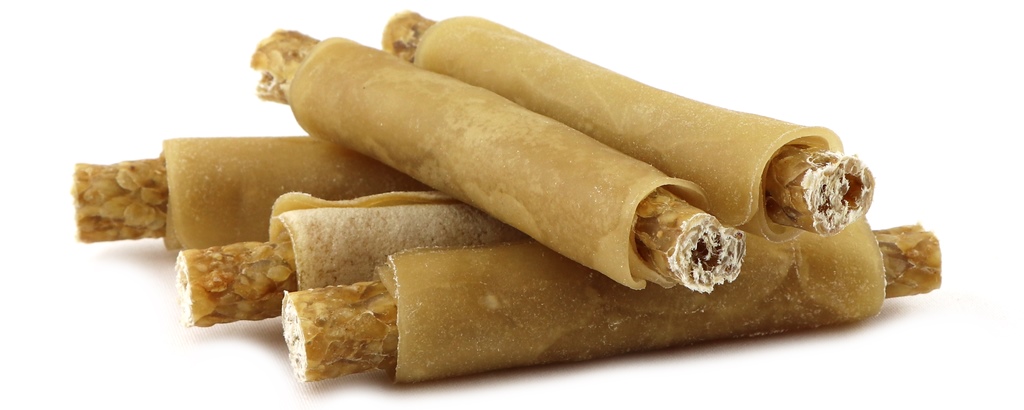 Die gefüllten Kaurollen bestehen aus 95% Rinderhaut, 3% Strauß, 2% Ochsenziemer.