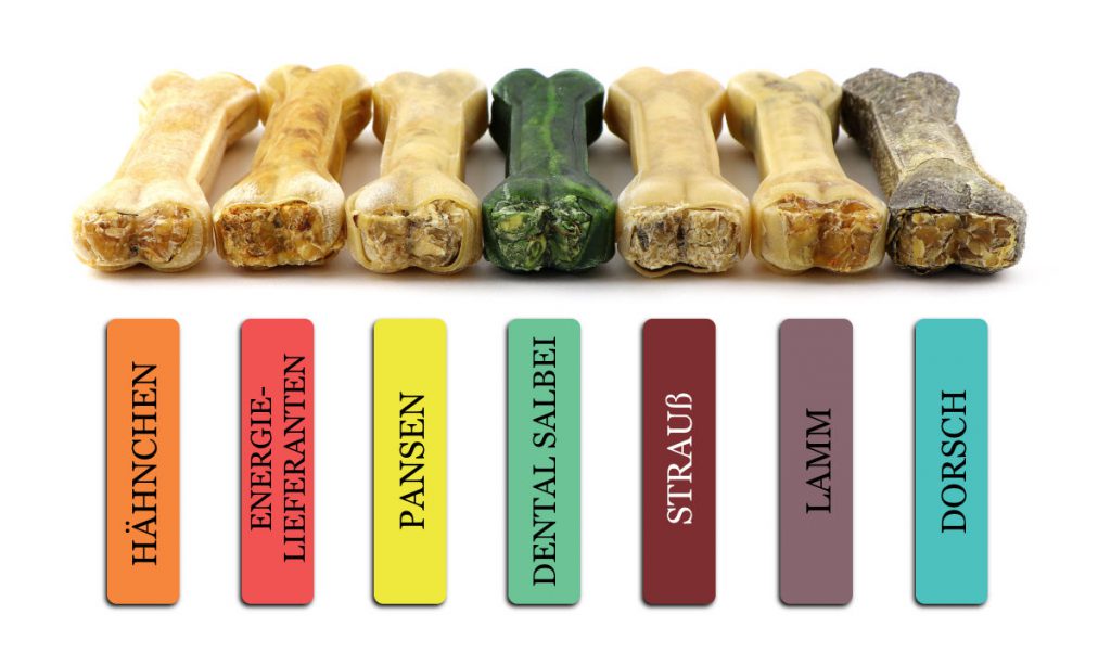 Rinderhaut mit Lamm; Rinderhaut mit Dental Salbei, Rinderhaut mit Strauß; Rinderhaut mit Dorsch; Rinderhaut mit Hähnchen; Rinderhaut mit Pansen; Rinderhaut mit Energielieferanten.