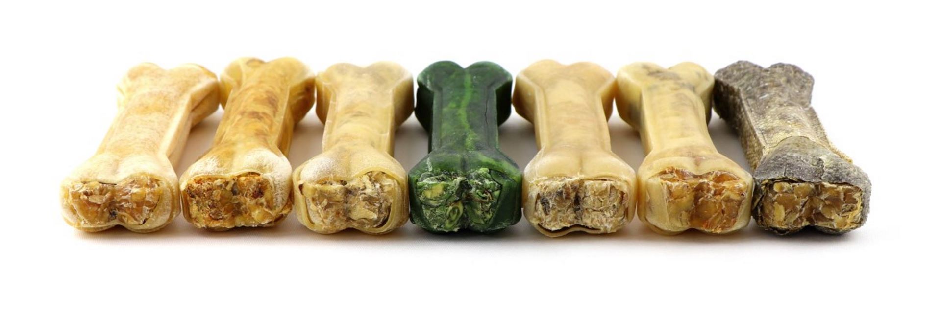 Unsere DOGBOSS Kauknochen bestehen zu 100% aus natürlichen Zutaten. Die Kauknochen sind aus Rinderhaut mit unwiderstehlich leckeren Füllungen.
