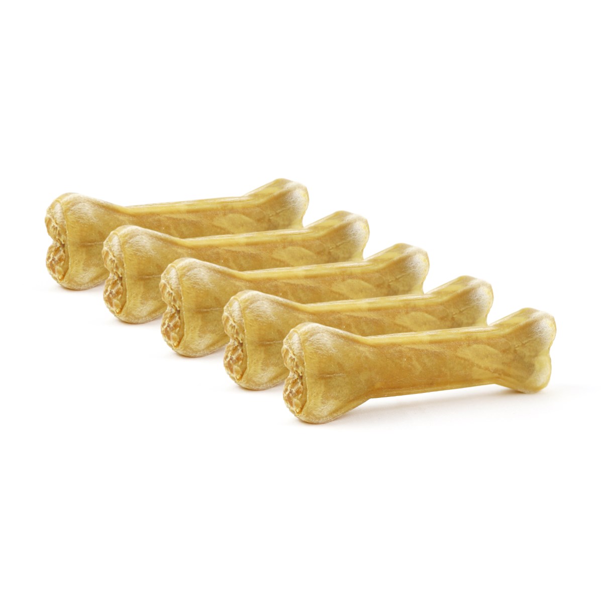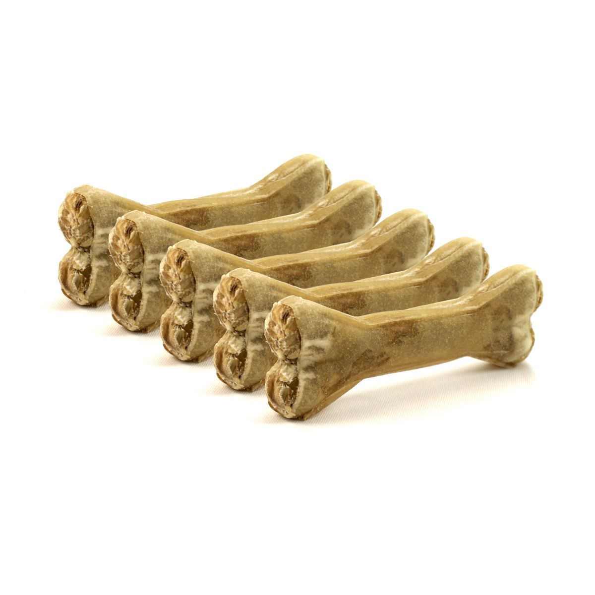 Gefüllte Kauknochen aus Rinderhaut, Pansen und Ochsenziemer, beliebtester Kauknochen für alle Hunderassen. Er überzeugt mit hoher Schmackhaftigkeit, ist gehaltvoll und proteinreich, fördert die Gesundheit des Hundes und ist sehr zufriedenstellend für unsere vierbeinigen Freunde. 12 cm, 17 cm oder 22 cm lang. Die Kauknochen bestehen aus 96% Rinderhaut, 3% Pansen, 1% Ochsenziemer.